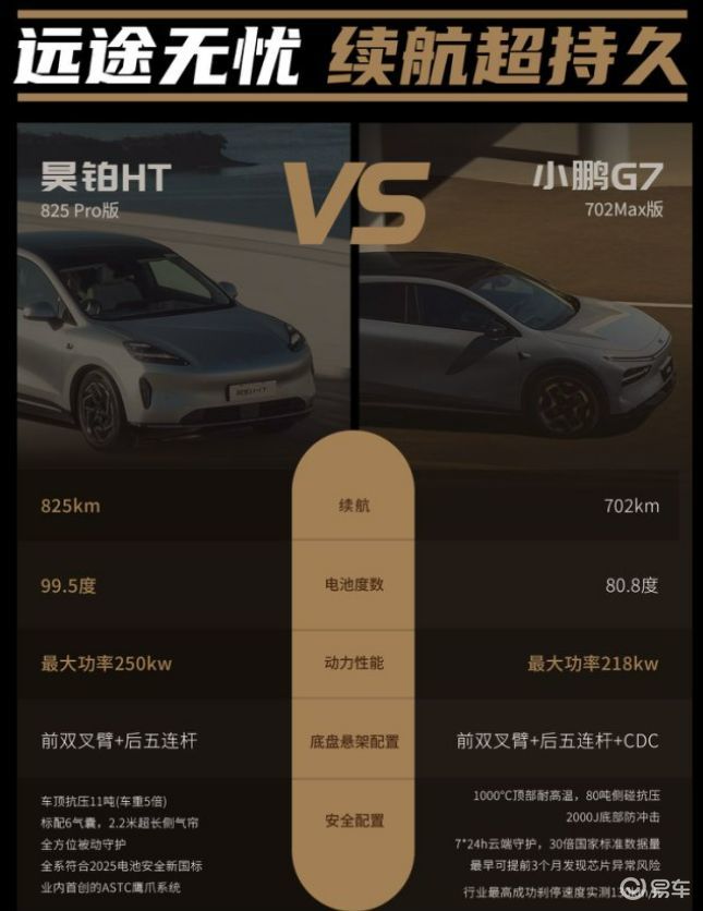小鹏G7虽宣传5C快充,但受限于三方桩兼容性问题,用户日常使用难以达成理论速率。更关键的是,其702km续航在昊铂HT的825km超长续航面前就失色不少,再叠加终身免费充电权益和昊铂全国22000根充电桩补能网络,构建了G7难以企及的用车生态闭环。