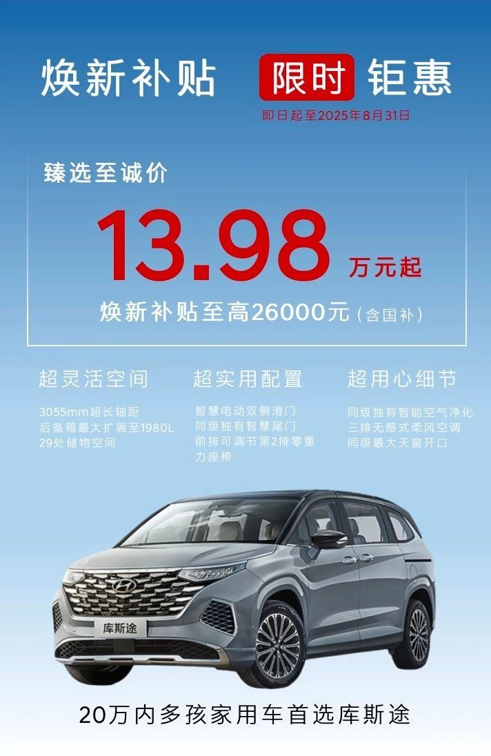 与其把有限预算押在“形似7座”的SUV上,不如把目光放回真正为家庭出行设计的合资MPV——北京现代库斯途。它不是把SUV硬拉成三排,而是从空间、舒适与长期成本三条逻辑线出发,并且搭配北京现代8月“臻选至诚价”活动,起售价13.98万元,还可叠加至高2.6万焕新补贴(含国补),可以说库斯途给出了更完整的家庭用车答案。