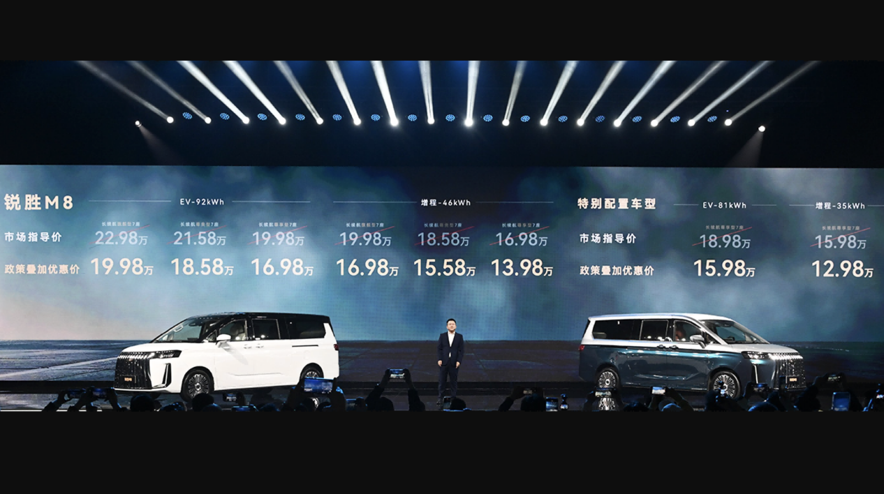 多元的动力选择,也是个亮点。锐胜M8提供了增程、纯电和CNG三种动力,增程版搭载1.5T增程器与电动机的组合,CLTC纯电续航可达230km,综合续航1420km,在快充模式下,电量从30%充至80%仅需10分钟。纯电版则同505km和560km两种续航,还支持800V高压快充,20分钟可补能320km。
