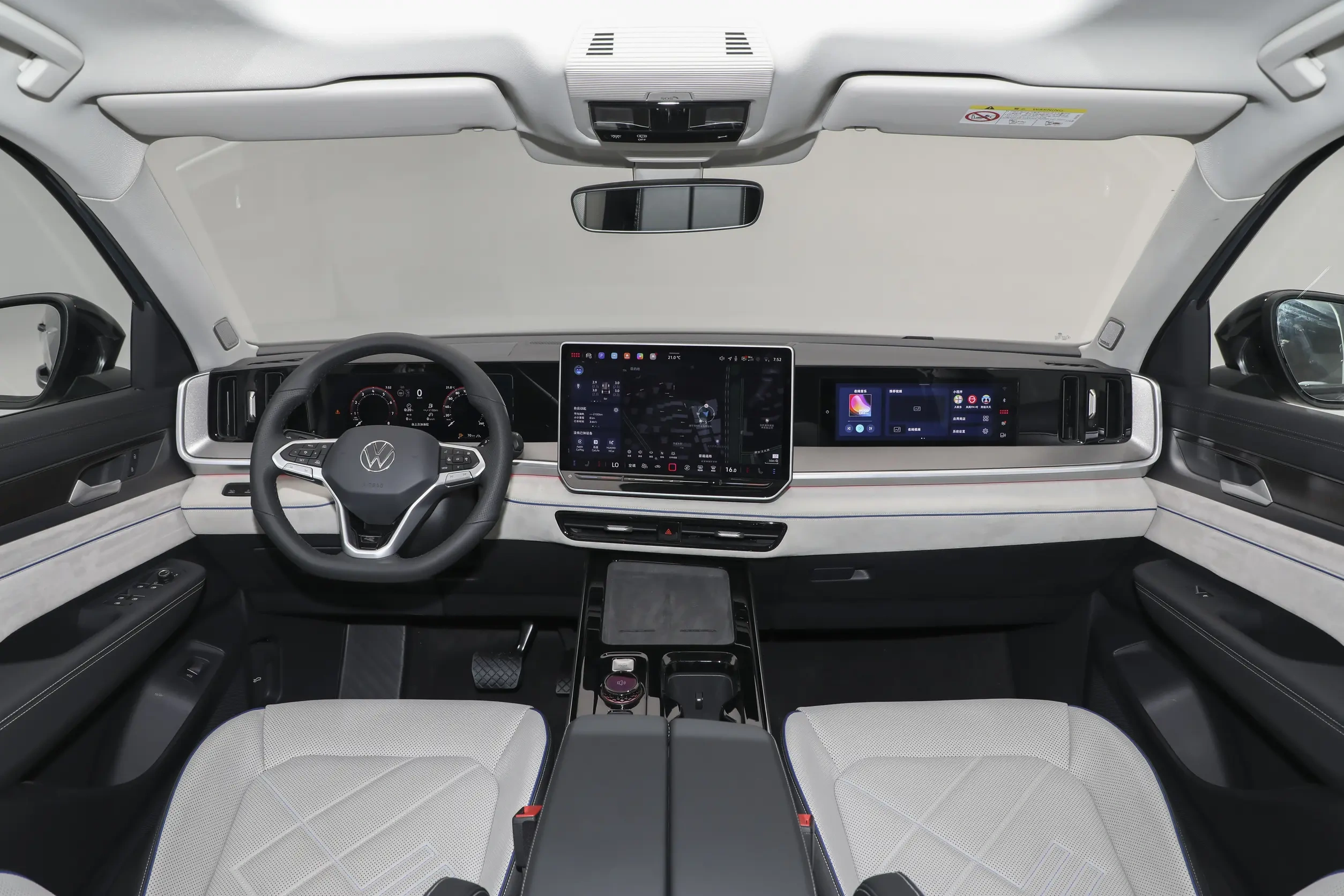 车内升级了最新的三联屏设计,与途昂Pro等车风格相近,悬浮式中控屏朝向主驾一侧,配有液晶仪表和嵌入式娱乐屏。车内使用电子怀挡,提供HUD抬头显示和双手机无线充电面板。