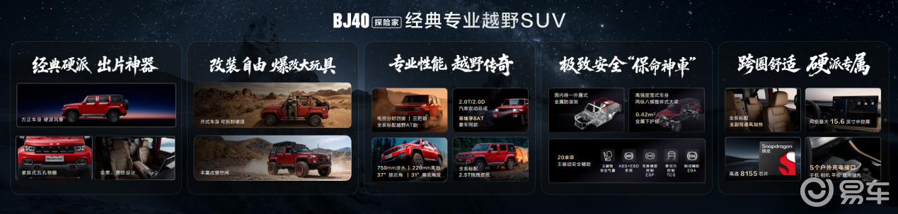 北京越野董事长王昊表示,BJ40作为中国越野的领路者,亲历过无数盛事荣耀,也成为中国汽车的独特文化符号,在全球用户的认可中走入了万千家庭。BJ40以探险家的名义,开启全新征程,在经典设计、自由改装、专业性能、极致安全和跨圈舒适五大维度再造新经典,为中国越野车市场再造经典专业越野SUV。
