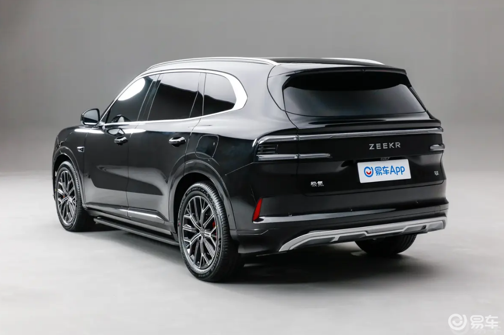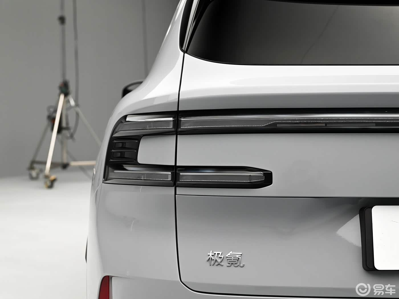 侧面来看,极氪8X身材魁梧,线条简洁干练,车顶略带一点弧度,粗壮的行李架也没有缺席,贯穿式腰线从前翼子板一直延伸到车尾,搭配轮眉和侧裙部分隆起的筋线,带来一定的层次感和力量感。车身下方配备的是五辐式低风阻造型轮毂,搭配红色卡钳,很有运动气息。此外,新车还将提供云珀红、月海灰、玄武灰、极夜黑、极昼白5种车色可选。车身尺寸方面,极氪8X的长宽高分别达到了5100/1998/1780mm,轴距为3069mm,定位是中大型SUV。与同级车型相比,新车的体量还是比较突出的,这也为内部空间提供了更多可能。
