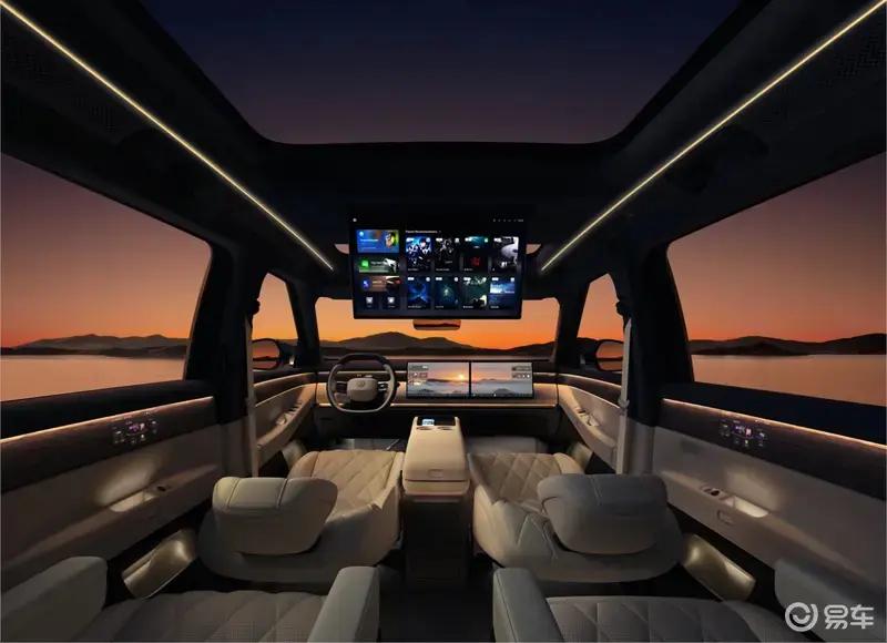 ID. ERA 9X搭载15.6英寸超高清中控主副驾双联屏,21.4英寸后排可折叠吸顶大屏搭配视角补偿膜,拓展视野。新车采用了六座布局,并配备女王座椅和第二排行政级座椅。