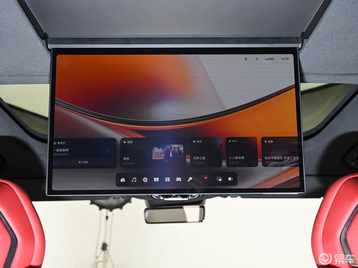 细节方面,新车前排整体延续了极氪9X的设计风格,中控屏与副驾娱乐屏采用连屏设计,主驾驶前方配备液晶仪表和HUD抬头显示。方向盘换装运动造型,中央通道设有运动扶手,车顶采用翻毛皮材质包裹,整体运动感较强。车顶还配有星辉钻彩灯环和晶钻物理按键,提升了车内质感。
