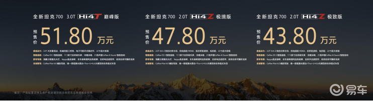 3 月 30 日,坦克品牌 “新时代・新旗舰 —— 人生自此新境” 预售发布会正式举办,全新坦克 700开启预售,推出 3.0T Hi4‑T、2.0T Hi4‑Z 两大动力版本共 3 款车型,官方预售价43.80 万‑51.80 万元。新车定位 “全域豪华 SUV 新旗舰”,以中华传统文化为根基、长城全栈自研技术为支撑,覆盖商务通勤、家庭出行、长途穿越、极限越野全场景,开创全域豪华 SUV 新品类,为高端用户提供无短板的豪华出行方案。