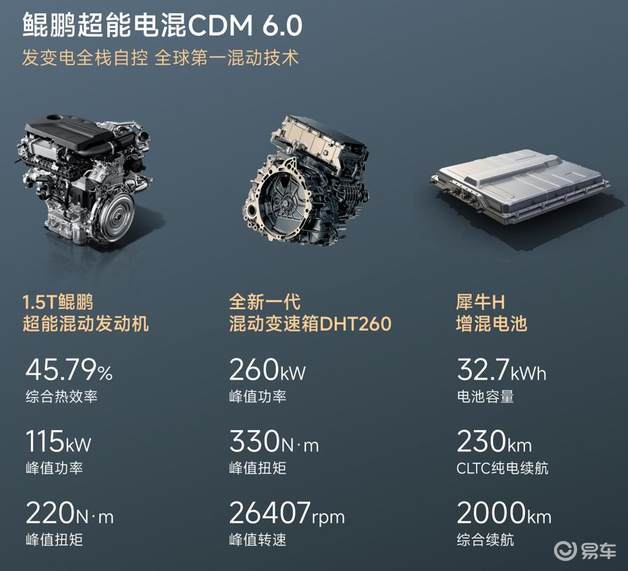 动力系统上,风云T9L搭载鲲鹏超能电混CDM 6.0系统,配备1.5T鲲鹏超能混动发动机与全新一代混动变速箱DHT260,其中DHT260变速箱最高机械效率达98.5%,这也是该车行驶平顺性的核心保障。实测显示,该车纯电模式下起步轻盈、静谧性出色,适合城市通勤;智能油电模式下,动力切换流畅无顿挫,可兼顾动力与经济性。