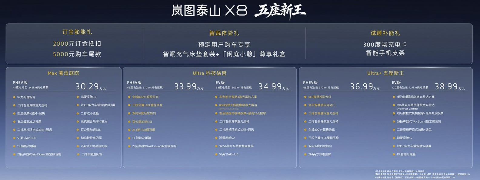 从产品来看,岚图泰山X8在空间、舒适、气场、科技、驾控、安全领域的有着不错的产品实力,官方定义其为“五座新王”。新车推出PHEV和EV两种动力形式共5款版型,包括Max版、Ultra版、Ultra+版。